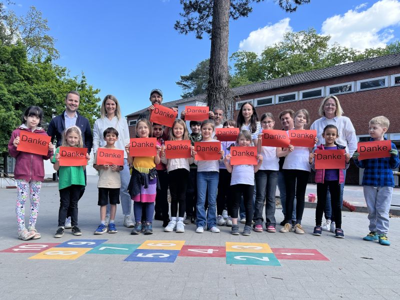 Seit Rosenmontag ist auf dem Schulhof der Albert-Schweitzer-Schule richtig was los! Denn dort gibt es jetzt bunte Hüpfekästchen und einen fröhlichen Zahlenwurm, auf denen die Kinder nach Herzenslust springen, hüpfen und zählen können.