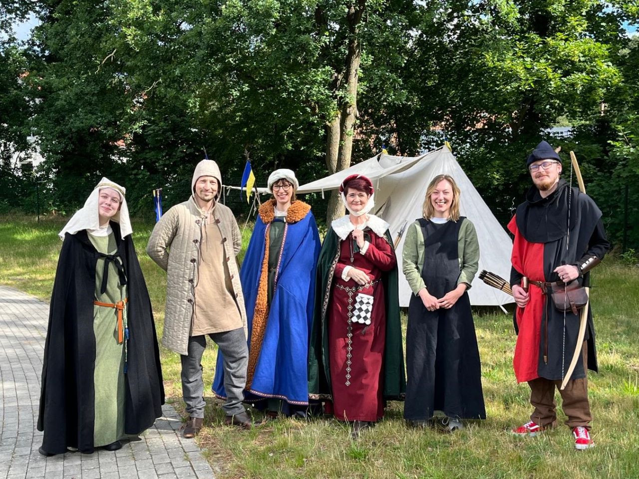 An verschiedenen Stationen konnten die Kinder in das mittelalterliche Leben eintauchen. Sie haben sich mit mittelalterlichen Gewändern eingekleidet, sich im Bogenschießen und Ritterkampf geübt, mit Tinte geschrieben, Beutel gebastelt ...