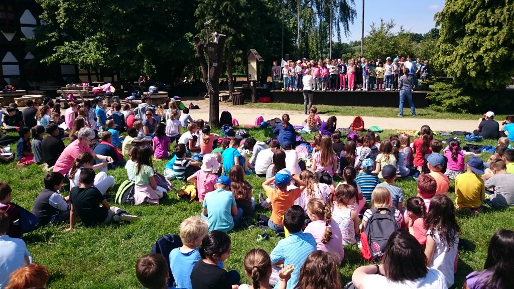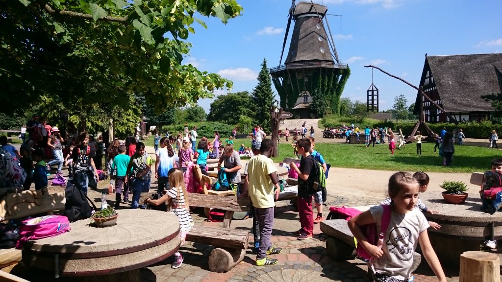 Dort angekommen schauen sich alle in kleineren Gruppen die Mühlen an. Gegen 11.00 Uhr treffen sich alle an der Freilichtbühne zu einem gemeinsamen Fest.
