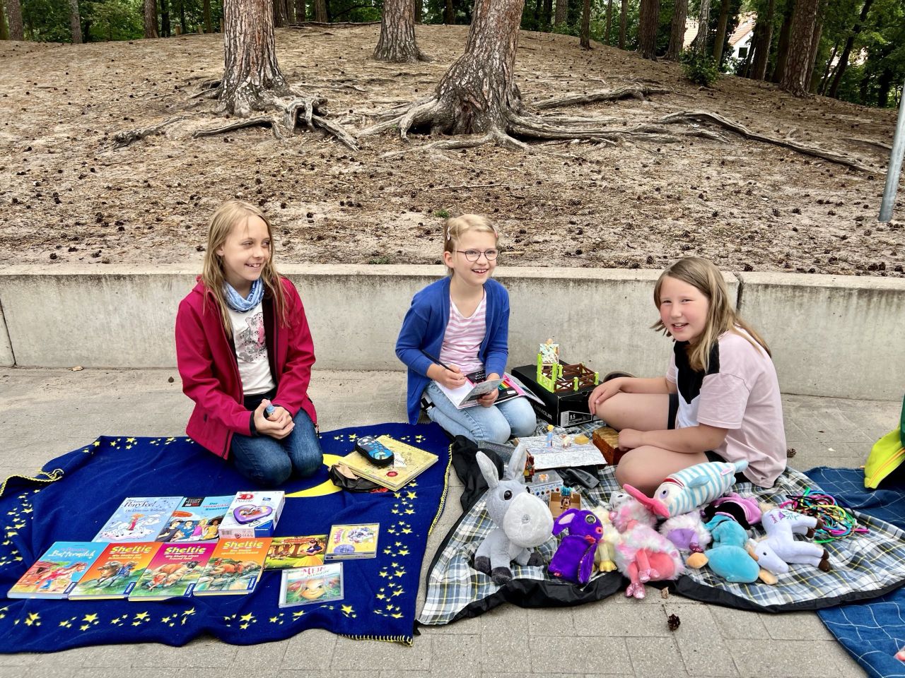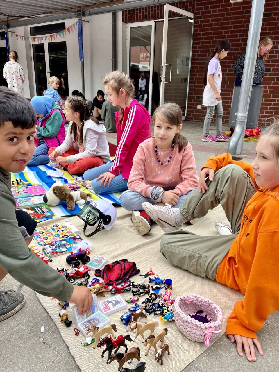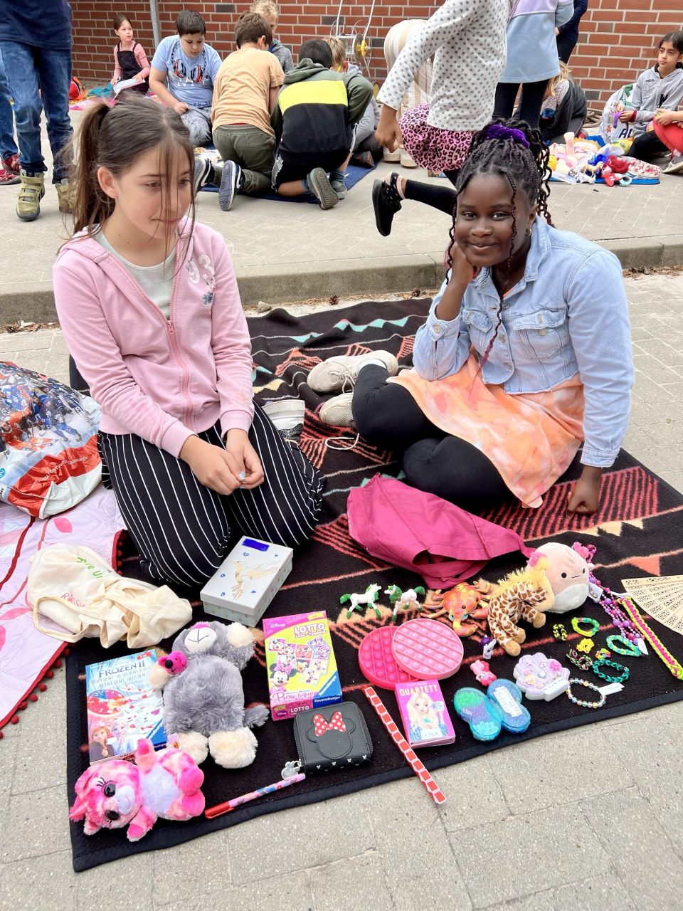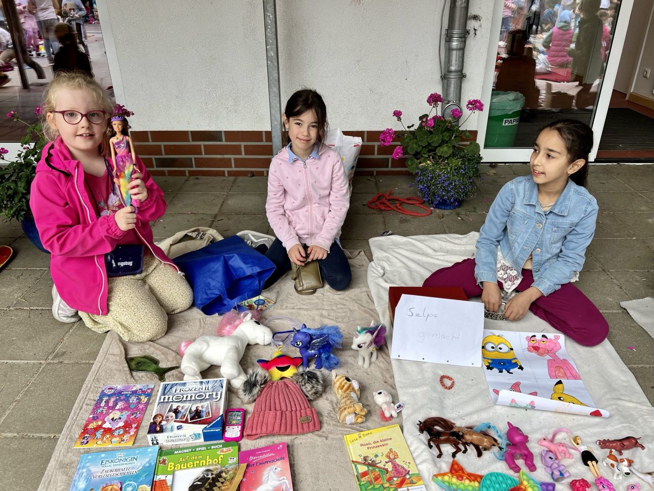 Alle Kinder können auf einer mitgebrachten Wolldecke Bücher, Spiele und andere Kleinigkeiten an Mitschüler und Lehrer verkaufen. Es hat sich bewährt, wenn Sie als Eltern mit den Kindern vorab Preise besprechen oder diese mit Krepp an den Gegenständen befestigen.